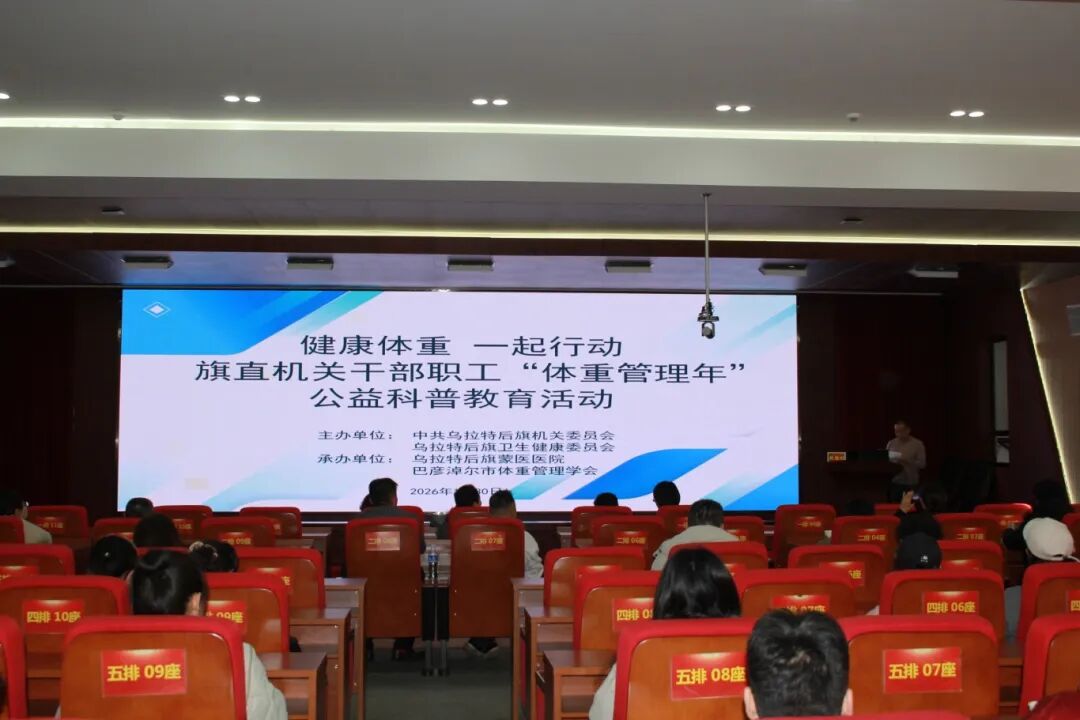 2026年1月30日,由旗机关党委、旗卫生健康委员会主办,旗蒙医医院承办的“体重管理一起行动——旗直机关干部职工‘体重管理年’公益科普教育活动”在旗党校报告厅举行。活动邀请到北京中健科汇国家医学研究院院长韩胜利为全旗广大干部职工带来一场精彩的健康科普讲座。
